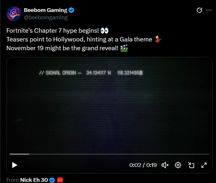 “Signal origin – 34.134117 N, 118.321495 W. Now playing, Zero Hour, Chapter Seven, Fortnite After Dark with Q & U. Early access. One night only. 11.19.25.”