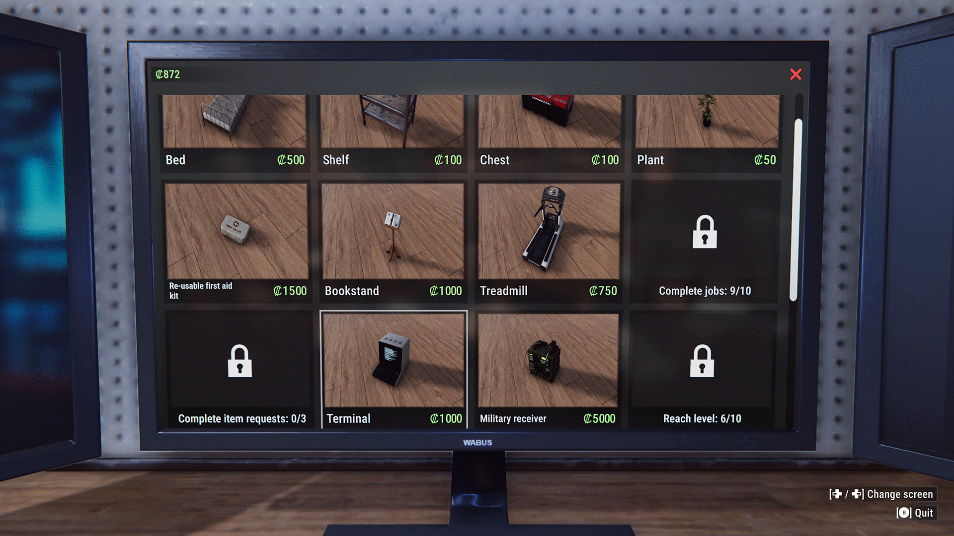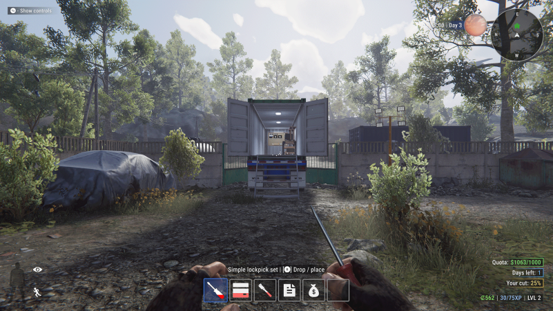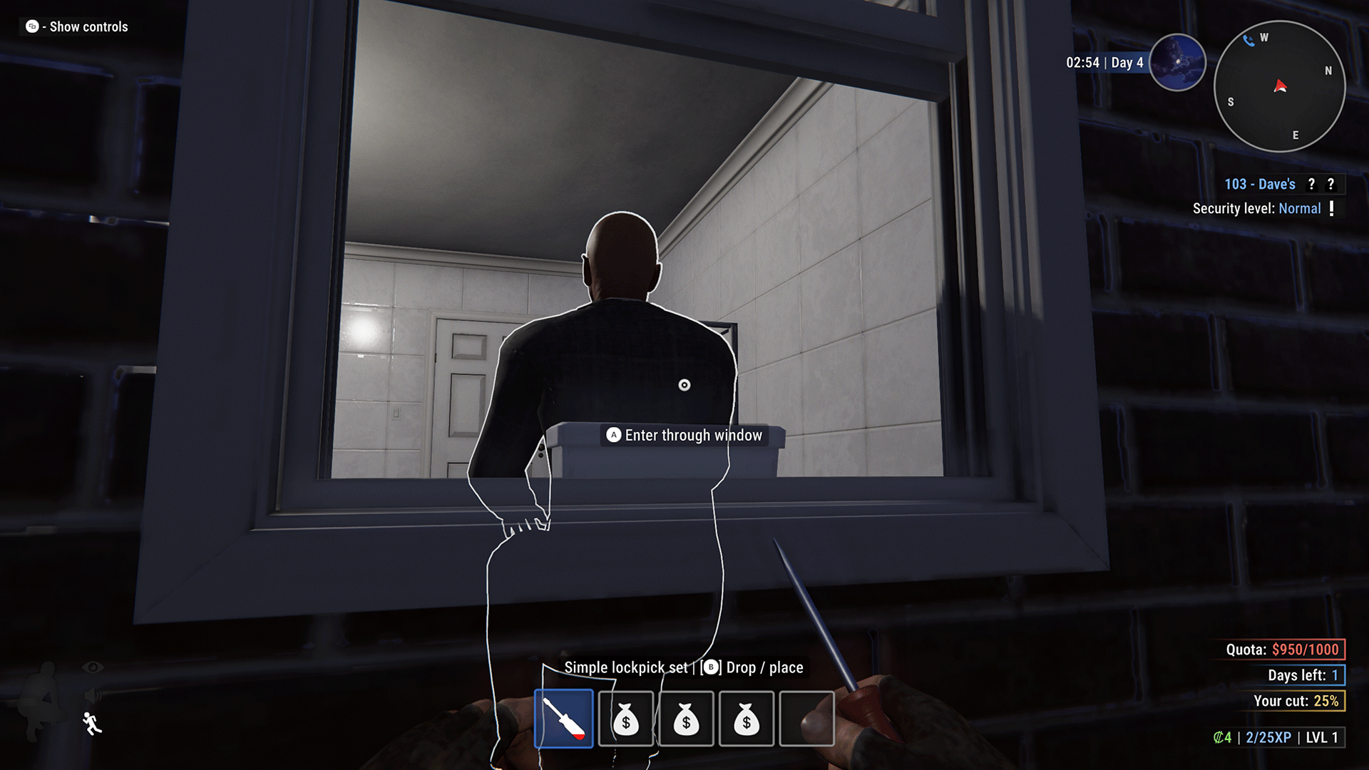 The player receives a cut of the profits from each bail payment made. This income plus the rewards for completing jobs, will be required to buy lockpicks and crowbars, for example; but as mentioned before, this money can also be used to buy furniture in your hideout. The hideout serves as your home base between runs and the game functions as a roguelite in this element. You return to this location to turn in your loot, access the marketplace, and embark on new runs. The furniture can spruce up the appearance of your empty lair, but its main purpose is to provide stat boosts. Buying a treadmill will increase your running speed, for example. This long-term character progression in addition to a skill system provides hours and hours of potential game longevity. I can easily picture addicts of the gameplay loop spending hours grinding enough cash to buff their character or simply stealing enough loot to fill their lair like some kind of Smaug-style mountain of treasure.