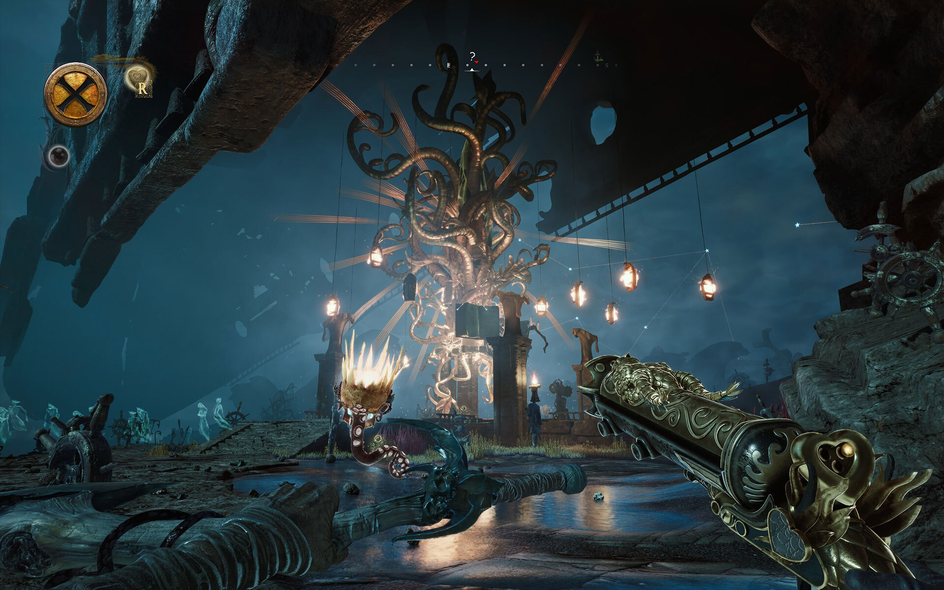 Our journey begins with Davy Jones being defeated, executed, and banished to the Locker. The Locker is like a pirate's Hell or Purgatory, full of nautical regalia and ghostly pirate souls. In order to ascend and escape the Locker, the player must rebuild Davy and Jones’ powers and abilities. The whole progression of the story consists of finding a “ship” to navigate the Locker and crew to help sail the ship through roguelite combat, culminating in a battle with the Kraken. We are told that once the Kraken is defeated, the bridge between the Locker and the land of the living will appear.