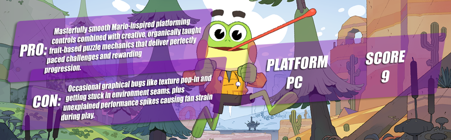 I must take a moment to admit that there were some bugs. Most of them, funny enough, were eaten by Hops because he is a frog and eating bugs functions as health packs. However, I experienced a few annoying but not mood-killing bugs. My laptop is relatively good, and I noticed moments when the fan's RPM would climb sharply, as if to indicate that it was straining under load. This didn’t seem to match the amount of motion or action on screen at the time, but it would subside within a few minutes without harm. The real bugs were usually graphical in nature. The game has a very distinct art style and look to it, but I would see texture pop-in around the edges of objects in the environments sometimes, as well as some larger pieces of terrain. This was pretty rare, but on more than one occasion I found myself stuck in the seams of two pieces of a building, or where the ground meets a wall, etc. I was never trapped there or forced to reload the game, but I think that these bugs only happened in longer play sessions, and reloading the game may preemptively resolve them.