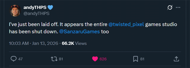 AndyTHPS shared on X that they had been laid off, with the entire Twisted Pixel games studio being shut down.
