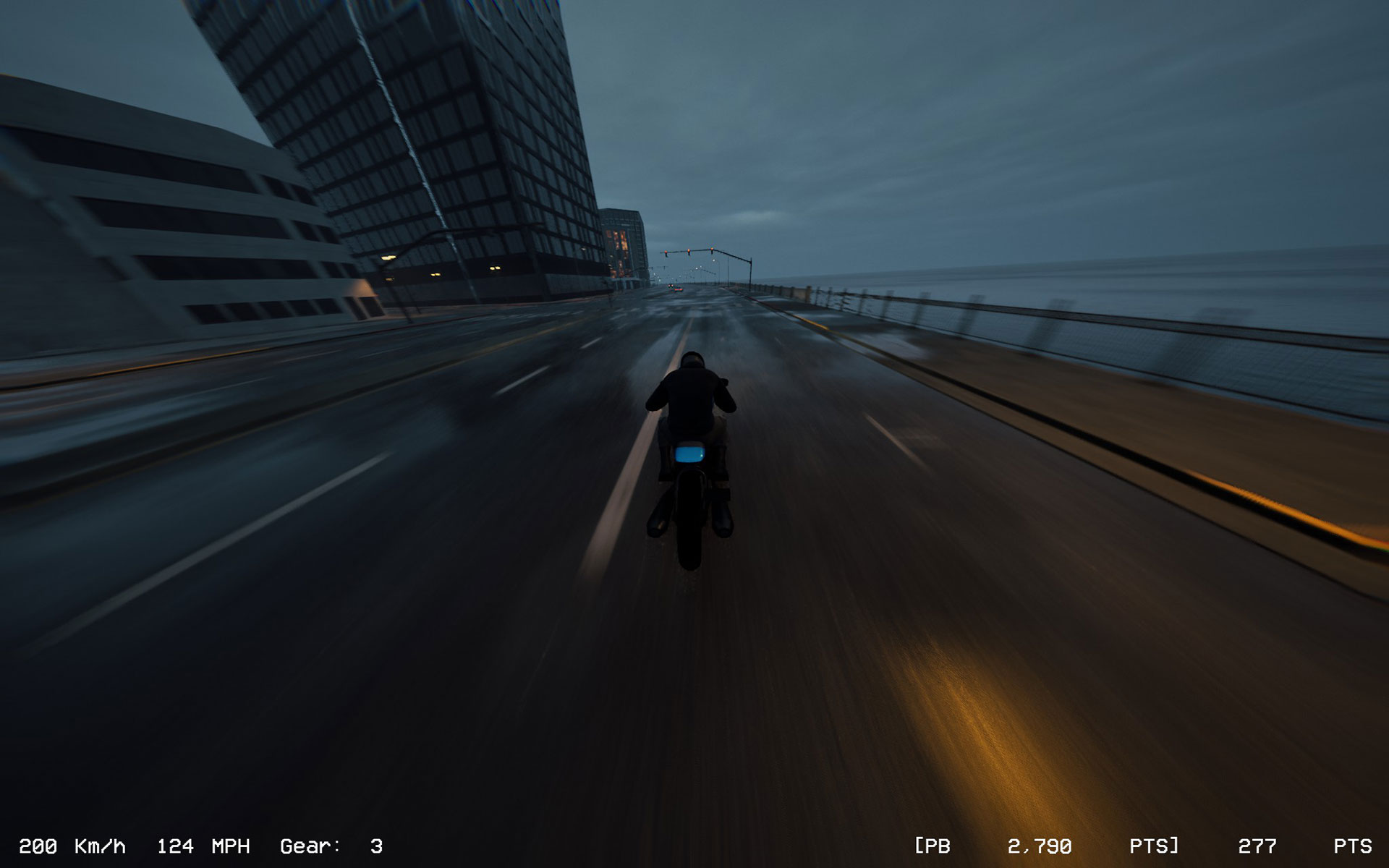 The long answer is: I like what I’ve played, but there is nowhere near enough content present to justify a purchase. There are only three small locations, nothing in the character select screen, the points grind for a new motorcycle is unappealing, and the controls for the default bike are weak. With all of that said, I think LANESPLIT has potential. When your bike gets up to speed and the music comes in, the rush of excitement is hard to deny. Likewise, I can imagine a more sedate multiplayer session of two friends chatting while cruising the highways. If the finished product is able to deliver more maps, perhaps a minimap option or the ability to set waypoints, and a dependable multiplayer suite, then I will absolutely recommend this to a friend.
