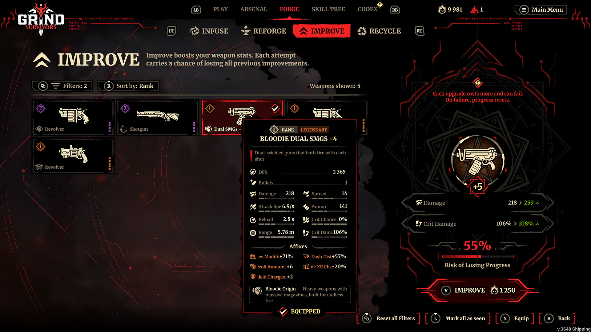 What makes Grind Survivors stand out among contemporary Survivors-like games is what happens between runs. There certainly are the typical stats to upgrade, but there is also an entire weapon looting system to utilize. Stats are upgraded with one currency obtained by defeating bosses, and the other currency is spent on upgrading weapons collected during runs. These weapons appear in color rarity - meaning common, uncommon, rare, legendary - and on top of that they are ranked by difficulty levels. In order to succeed in this game, I need to find a weapon that I want to build a strategy around and then level it up as much as possible. Additionally, the difficulty level means that my Teslagun example from before is excellent in Dark Forest LVL 1 but not nearly as effective in Dark Forest LVL 2 or 3. This constant need for improved weapons and the wide variety of weapons to build strategies around ensures that there are literally hundreds of hours of gameplay potential. Revolvers, SMGs, shotguns - they are all options that have entirely different stats and capabilities. Personally, I found that each weapon type was completely viable if perks and abilities were built up around it. There is a huge incentive to try new builds or strategies in order to progress to the next difficulty and eventually unlock new maps.