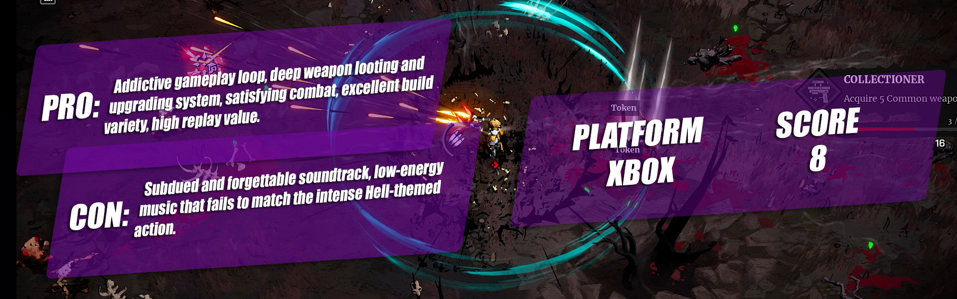 The weakest element of Grind Survivors is the audio. There is a very subdued soundtrack that plays throughout each run, but it is so low-energy and lackluster that I struggle to even remember it. There is the usual barrage of sounds coming from your weapon and the various effects going off, but that should be blanketed in a thick theme song. In this case, the game provides a vaguely metal-sounding backtrack. All things considered, it is a small complaint, but the gameplay and Hell theme deserve better music in my opinion. Hypothetically, Mick Gordon would have chewed up this gameplay and elevated the experience to heights not seen since Vampire Survivors itself, but I digress.